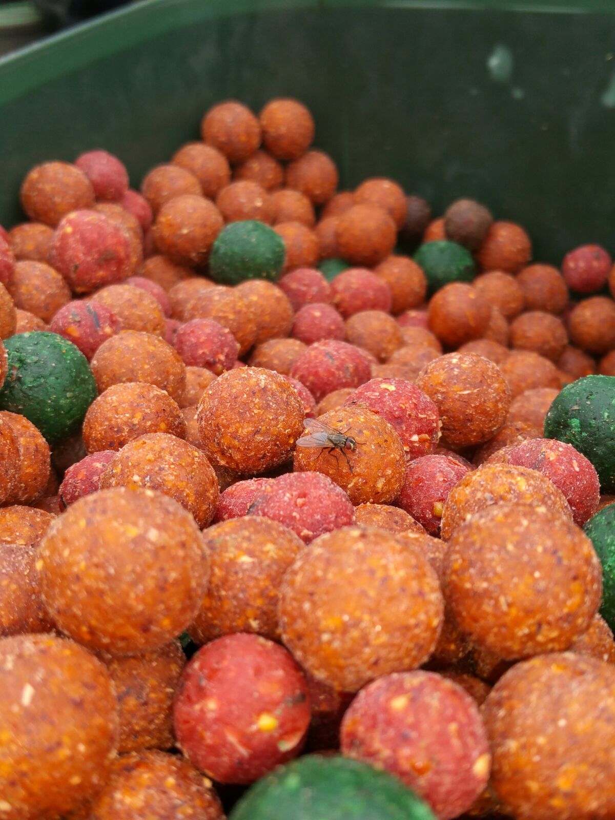 Boilies sind, wie der Name schon sagt, in Wasser gekochte Teigkugeln (engl. to boil - kochen). Da sie durch das Kochen hart und trocken werden, halten die Boilies am Haar lange im Wasser und zerfallen erst nach langer zeit. Der durchschnittliche Boilie hat einen Durchmesser von 20 Millimetern. Je größer der Boilie, desto geringer ist die Wahrscheinlichkeit kleinere Karpfen zu überlisten. In trüben Gewässern kommen bei vielen Karpfenanglern sogenannte Pop-Up`s zum Einsatz. Diese werden mit dem Boilie auf das Haar aufgezogen und das Boilie bekommt unter Wasser einen auftrieb. Zum anfüttern kommen Partikel und Pellets zum Einsatz. Mit Wasser vermischt bildet sich eine teigähnliche Masse, die man am Futterplatz ins Wasser wirft.